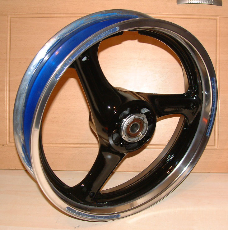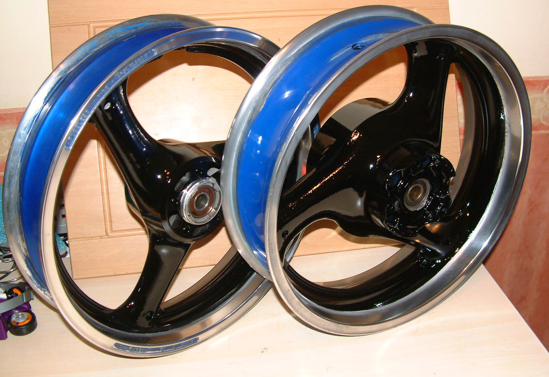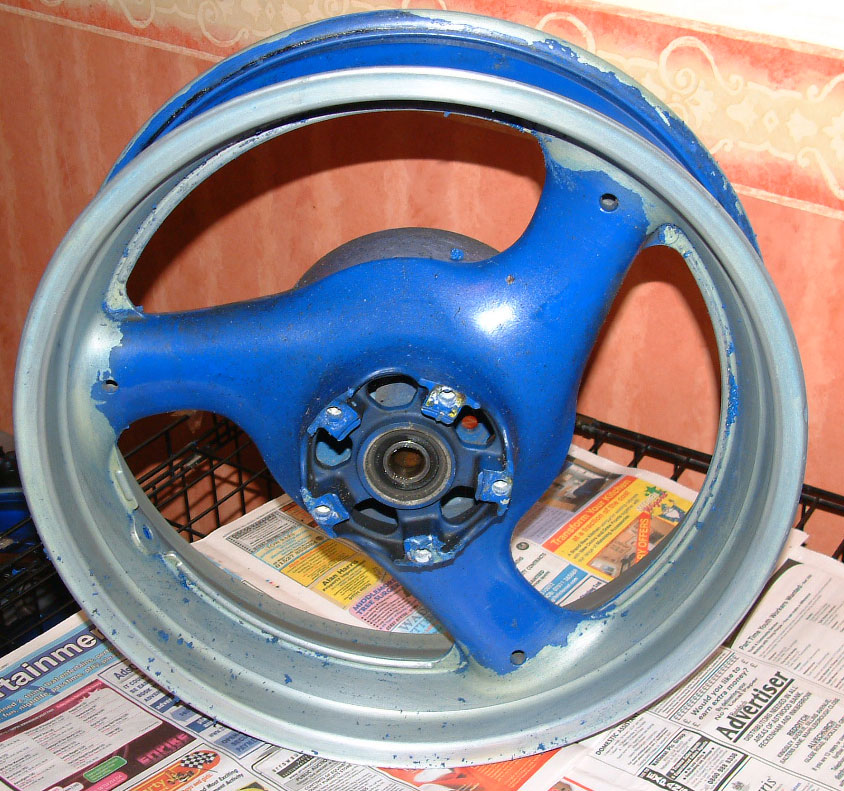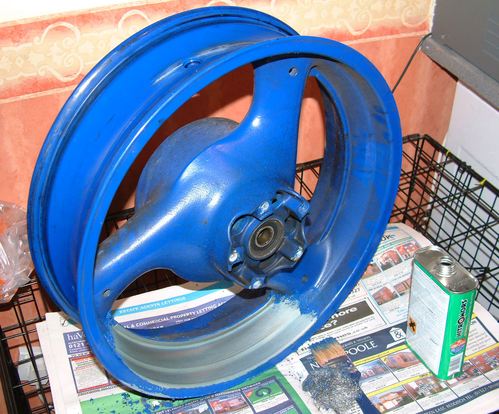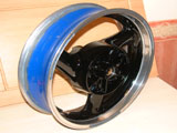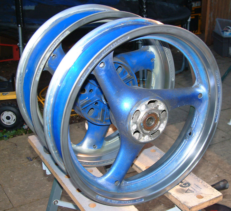 I started by removing the wheels from the bike, stripping the wheels down to bare minimum then attacked them with some Nitromors paint stripper and steel wool.Then i used 3 grades of abrasive mops, after many hours and a new drill (after burning the old one ou)t i carried on with the polishing mops.Once polished to my satisfaction i masked the rims off and sprayed them with 2k epoxy high gloss paint.